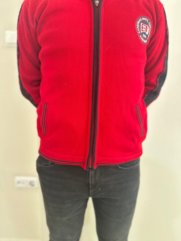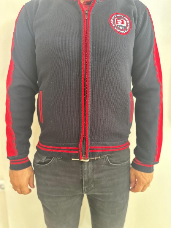 Erkekler için: Lacivert renkli kollar bordo şeritli kapüşonsuz hırka